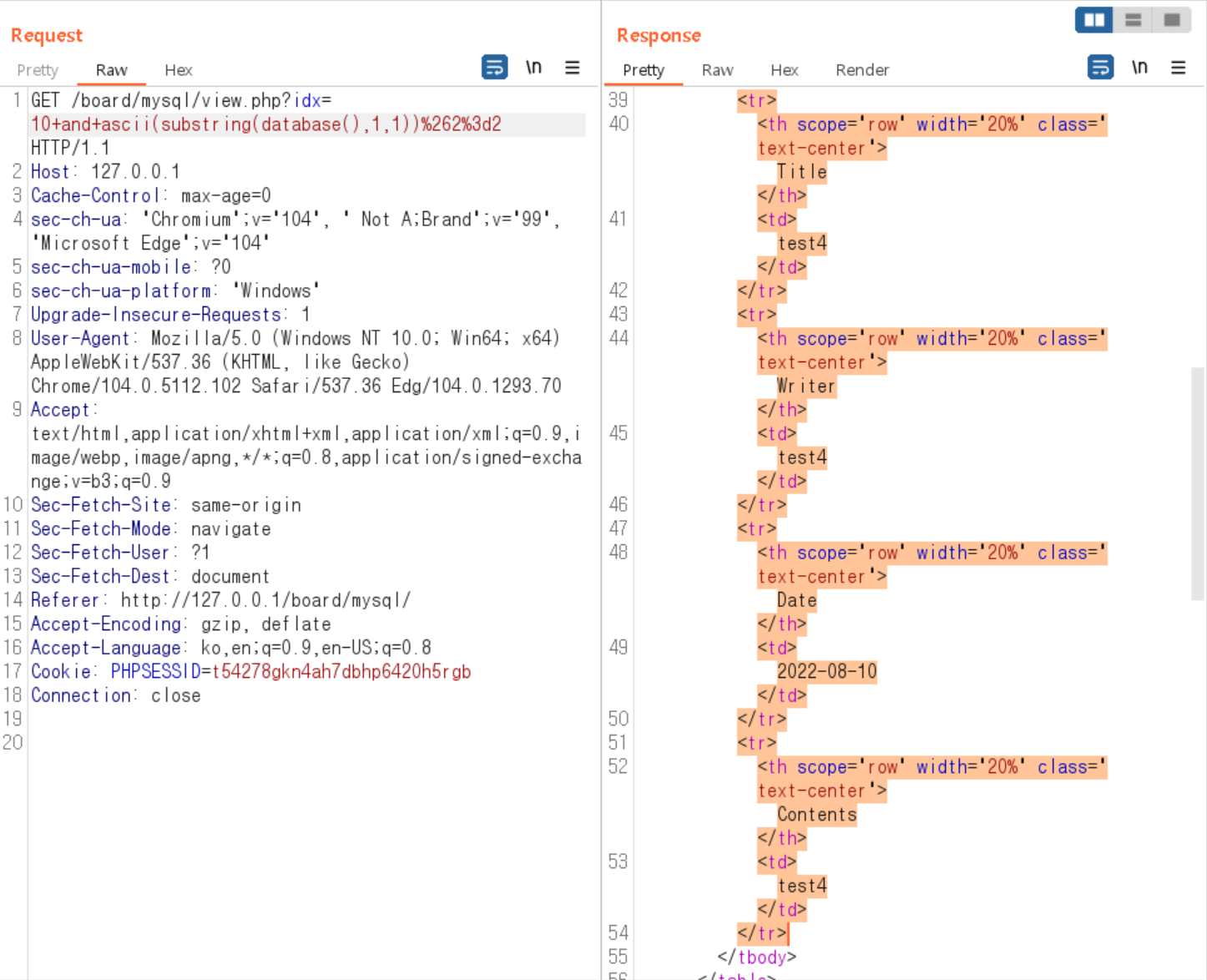 | idx=10 and ascii(substring(database(),4,1))&32=32 | 참(게시글 정상 출력) 1 | |