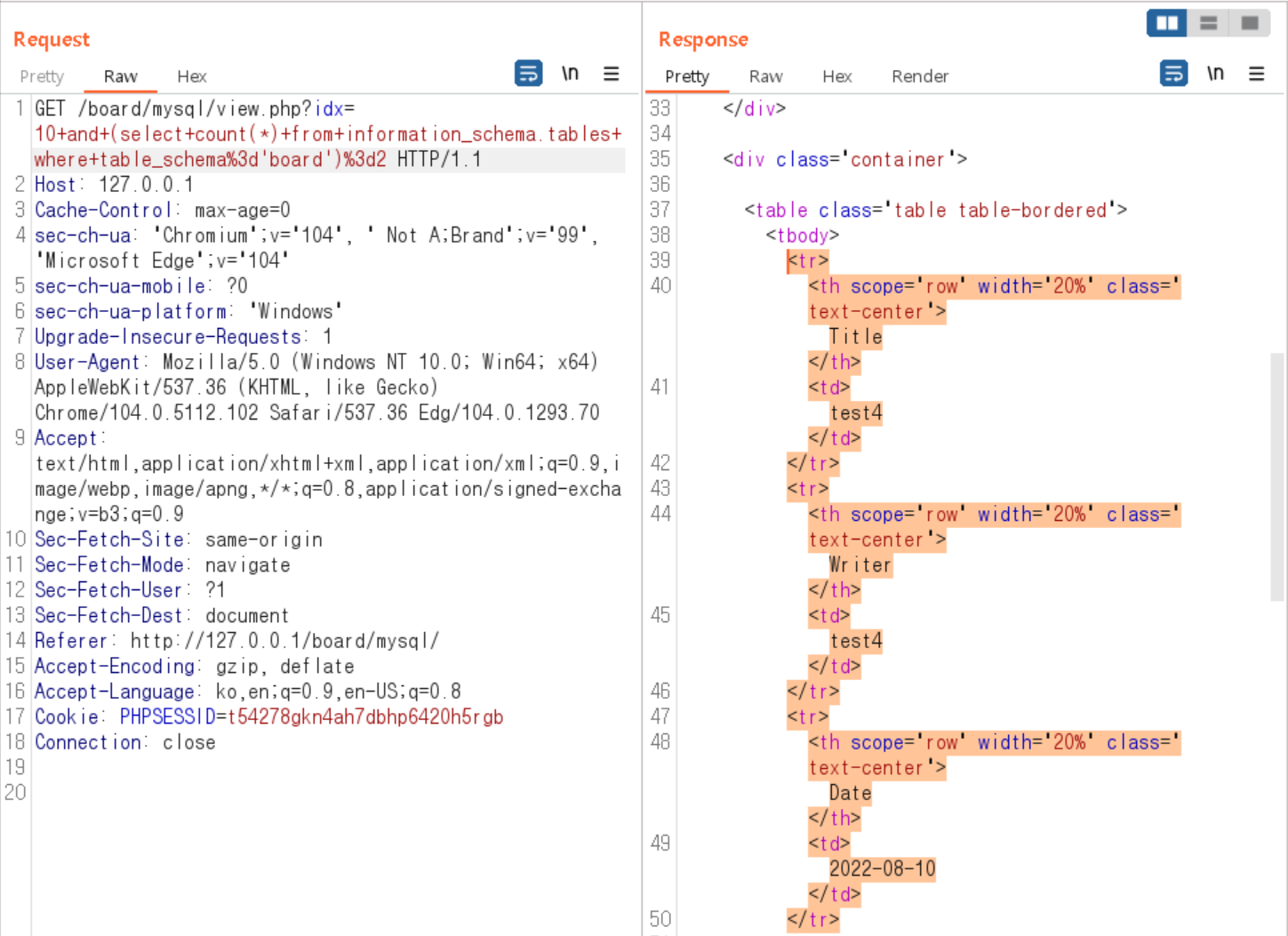 | idx=10 and ascii(substring((select table_name from information_schema.tables where table_schema='board' limit 0,1),1,1))&64=64 | 1 | |