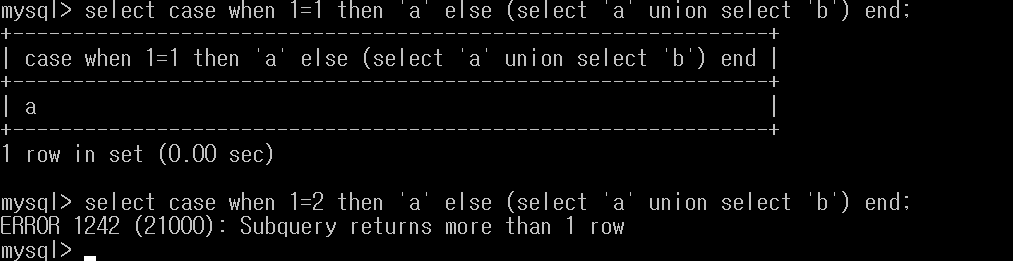 select case when 1=2 then 1 else (select 1 union select 2) end; | 하위 쿼리에서 값을 둘 이상 반환했습니다. 하위 쿼리 앞에 =, !=, <, <=, >, >= 등이 오거나 하위 쿼리가 하나의 식으로 사용된 경우에는 여러 값을 반환할 수 없습니다. Error code: 512 SQL state: 21000 |