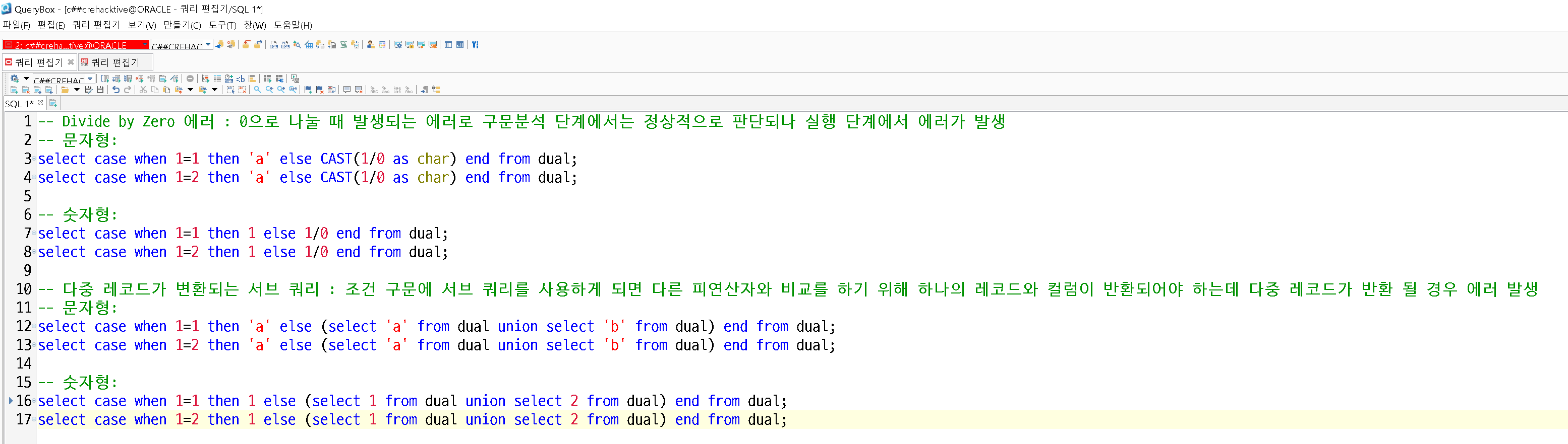select case when 1=2 then 1 else 1/0 end from dual; | ORA-01476: 제수가 0 입니다 Error code: 1476 SQL state: 22012 |