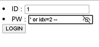 id='' and idx=2 | TRUE | id='gugucon' 의 idx가 2니까 T |